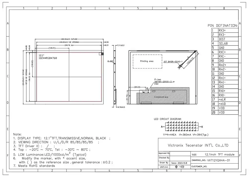 VXT121QXHA-01 to moduł TFT-LCD. Składa się z panelu TFT-LCD, sterownika IC, FPC, tylnego światła, płytki drukowanej. Obszar wyświetlacza 122.1 ¢ potrzebta zawiera 1024 x 768. Piksele i może wyświetlać do 16,7 m. Ten 12,1 cala 1024*768 Moduł IPS Outdoor IPS jest zgodny z kryterium środowiskowym ROHS.