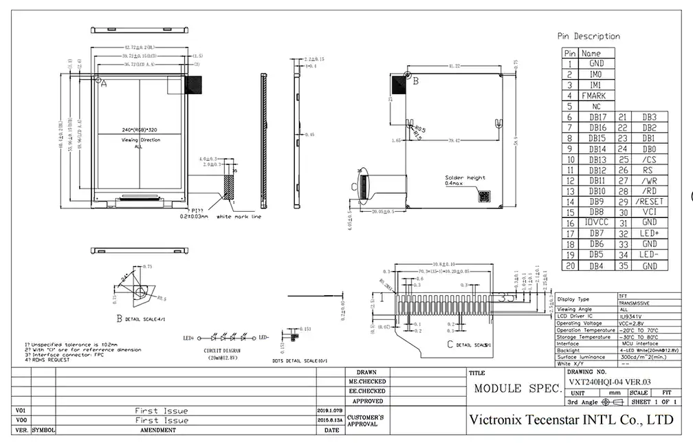 Jakie są zalety modułu IPS Victronix 2,4 cala 240x320 IPS w sytuacji konkurencyjnej producentów modułów TFT? Po pierwsze, osiąga typową jasność 300 CD/m² i ma współczynnik kontrastu 800: 1, zapewniając doskonałą widoczność nawet w trudnych warunkach oświetlenia. Po drugie, ma 4-DIE biały system podświetlenia LED z typową żywotnością od 30 000 do 50 000 godzin (do 50% jego początkowej jasności), zapewniając wyraźną widoczność i przedłużone zastosowanie w różnych warunkach oświetlenia. Poza tym jest on zatwierdzony w ramach kontroli MIL-STD-105E II, ochrona ESD (± 8 kV powietrza/± 4KV kontakt) i testów ostrego środowiska (wstrząs termiczny, wilgotność, wibracja), umożliwiając bezproblemową działanie w rozszerzonym zakresie temperatur -20 ° C do +70 ° C.