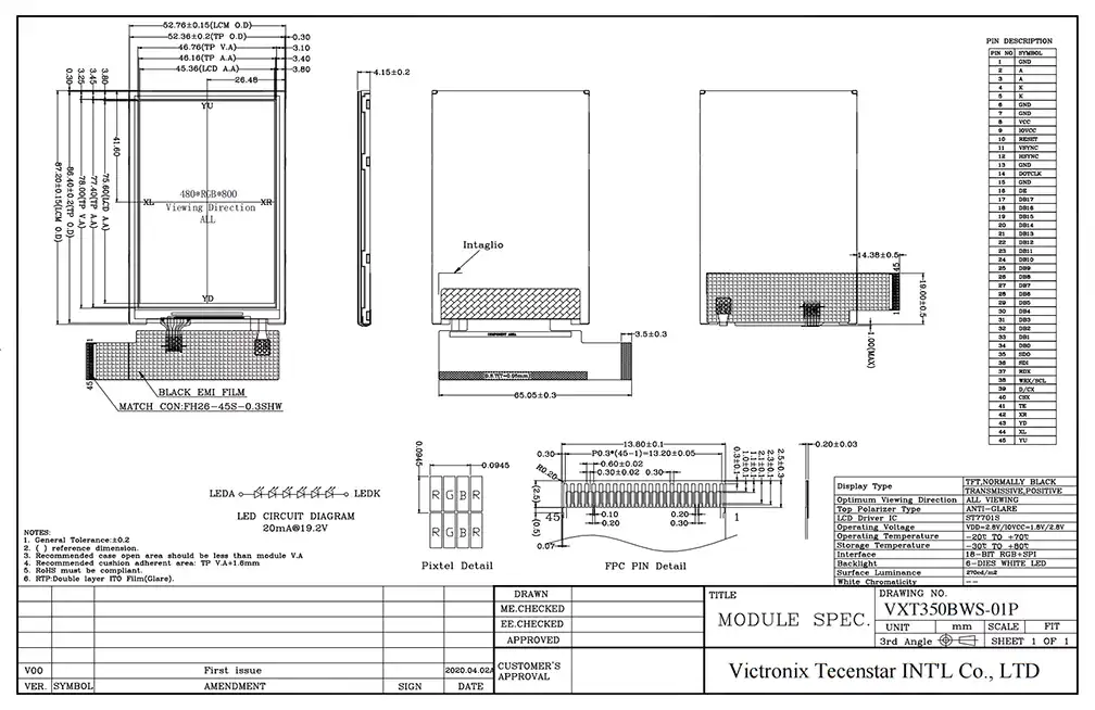 Ekran dotykowy to wyświetlacz, który wykrywa wejście dotykowe użytkownika, umożliwiając użytkownikowi interakcję bezpośrednio z wyświetloną zawartością bez potrzeby myszy, touchpad lub innego podobnego urządzenia. Jest często używany w smartfonach, tabletach, laptopach i innych urządzeniach elektronicznych. Jako profesjonalny producent i dostawca modułu TFT w Chinach, jakie są zalety tego modułu dotykowego Victronix 3.5 '' 480x800 IPS? Początkowo oferuje typową jasność 270 CD/m² i wysoki współczynnik kontrastu 1000: 1, aby zapewnić stały kolor i przejrzystość. Po drugie, obsługuje konstrukcję: Film ITO (odporna na zarysowania powierzchnia połysku) + 0,7 mm szkło temperowane (całkowitą grubość: 1,15 ± 0,05 mm). Poza tym ma 6-Die White LED System podświetlenia LED o długości 50 000 godzin, utrzymując 50% retencję jasności, aby zapewnić długoterminową użyteczność w różnych zastosowaniach przemysłowych. Ponadto przechodzi rygorystyczne testy skrajne środowiskowe, w tym wysokiej/niskiej operacji i magazynowania temperatury, wilgotne ciepło, wstrząs termiczny (± 30 ° C/± 80 ° C), ESD (± 8 kV powietrza/± 4KV kontakt), wibracje, wstrząs mechaniczny i testy zrzutu w celu obsługi niezależności w ekstremalnych temperaturach (-20 ° C do +70 ° C).