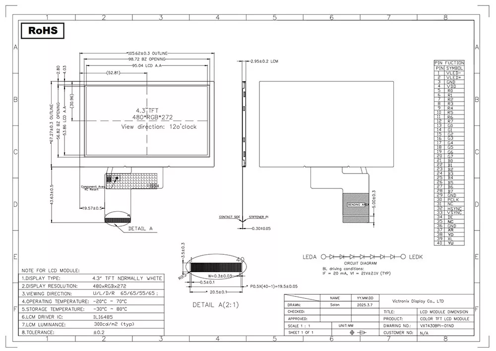 TFT LCD jest rodzajem wyświetlacza ciekłokrystalicznego, który wykorzystuje technologię tranzystorową cienkowarstwowej w celu zwiększenia jakości obrazu, i ma wiele zastosowań w życiu codziennym. Jako profesjonalny producent i dostawca modułów TFT w Chinach, co sprawia, że Victronix 4,3 cala 480 × 272 Moduł przemysłowy TFT różni się od innych producentów? Po pierwsze, oferuje typową jasność 300cd/m², szeroki kąt widzenia 65 ° w kierunku 12 i współczynnik kontrastu 700: 1, zapewniając doskonałą czytelność z różnych punktów. Po drugie, integruje jednostkę podświetlenia wykorzystującą białe diody LED 7S1P z typowym okresem życia od 30 000 do 50 000 godzin (do 50% początkowej jasności), zapewniając wyraźną widoczność we wszystkich warunkach oświetlenia. Poza tym obsługuje interfejs RGB z kontrolerem ILI6485. Ponadto przechodzi rygorystyczne testy środowiskowe, w tym wstrząs termiczny (-30 ° C ↔ +80 ° C), przechowywanie wilgotności (60 ° C/90% RH) i wibracje mechaniczne, zapewniając, że może działać płynnie w rozszerzonym zakresie temperatur (-20 ° C do +70 ° C).