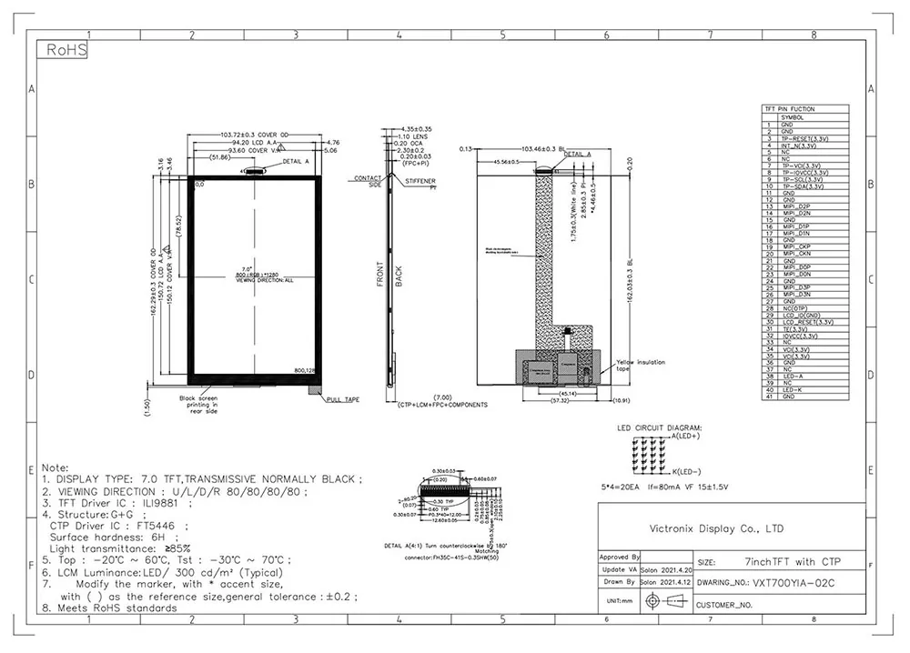 VXT700YIA-02C to moduł TFT-LCD. Składa się z panelu TFT-LCD, sterownika IC, FPC, światła tylnego i CTP. Obszar wyświetlacza 7,0 ¢ potrzebta zawiera 800 x (RGB) x 1280 pikseli i może wyświetlać do 16,7 m. Ten produkt jest zgodny z kryterium środowiskowym ROHS.