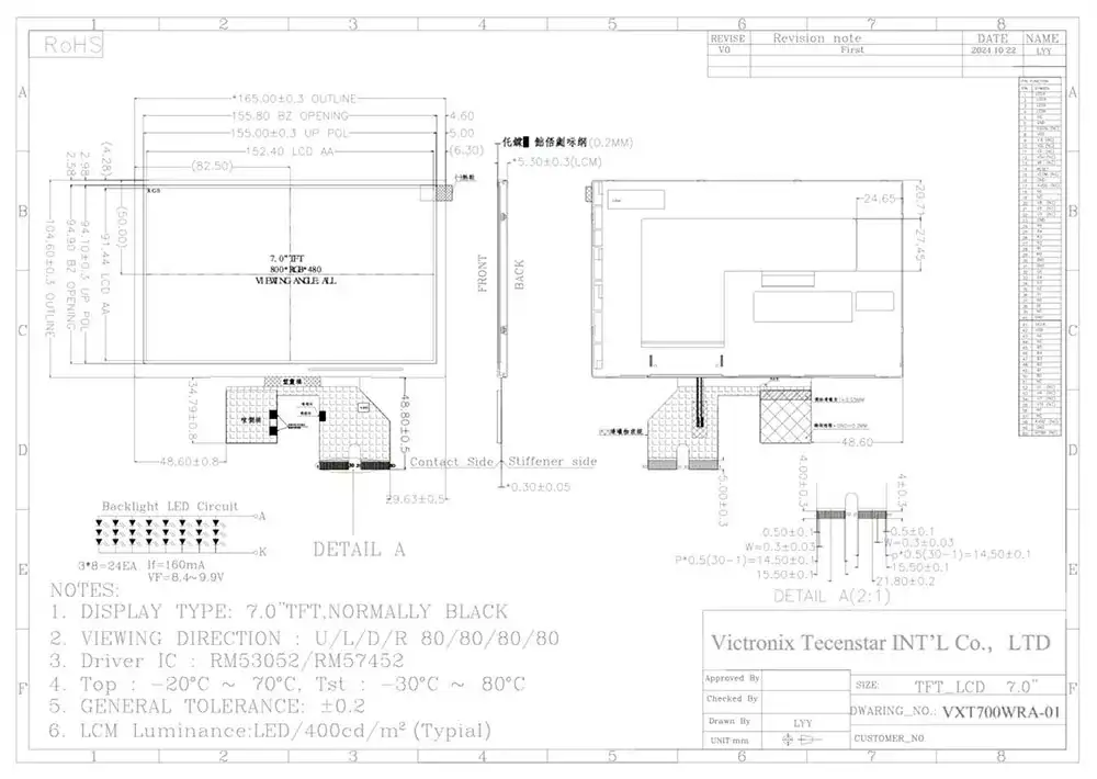 7 -calowy moduł TFT jako wspólny rozmiar, jakie są konkurencyjne zalety modułu Victronix 7 cali 800 × 400 IPS? Początkowo zawiera panel TFT-LCD, IC, IC, FPC i jednostkę podświetlenia. Ma 7 -calowy obszar aktywny (152,40 × 91,44 mm), 800 (h) × 480 (v) rozdzielczości pikseli i głębokość kolorów 16,7 m, aby zapewnić użytkownikom wyraźny wyświetlacz. Po drugie, integruje białą jednostkę podświetlenia LED 3S8P z typową jasnością 400 CD/m² (75% minimalnej jednolitości) i żywotnością znamionową 30 000-50 000 godzin (przy 50% początkowej jasności). Ponadto ma nie tylko standardowy 18-bitowy interfejs RGB (6 bitów na kolor), DE (włączanie danych) i tryby synchronizacji HV w celu uproszczenia integracji, ale ma wysoki współczynnik kontrastu 800: 1. Moduł Victronix 7 cali 800 × 400 IPS TFT jest zgodny z ROHS i testowany przez surowe protokoły branżowe, aby zapewnić klientom produkty wysokiej jakości.